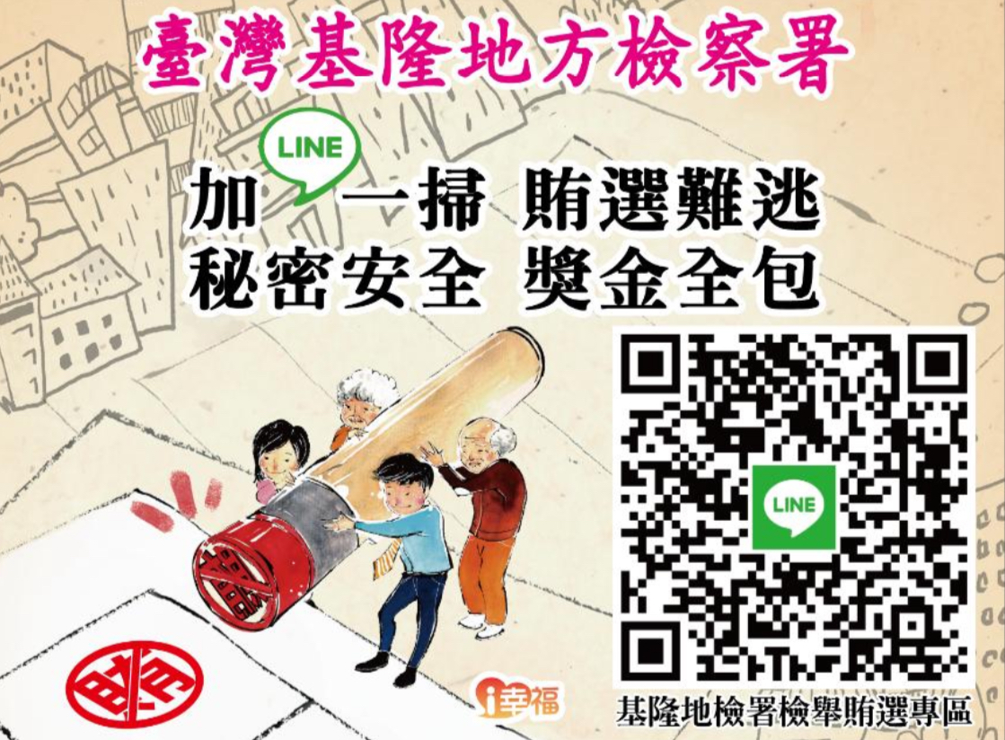 基隆地檢署更推出科技查賄新對策,設置「基隆地檢署檢舉賄選專區 line qr code」,邀請大家加入,若有賄選情資想秘密、安全且直接向檢察官提出檢舉者,即可透過「基隆地檢反賄專區 line@」發送訊息,該訊息將由基隆地檢署查賄專責人員負責接洽辦理,檢舉者的身分絕對保密,請大家放心使用