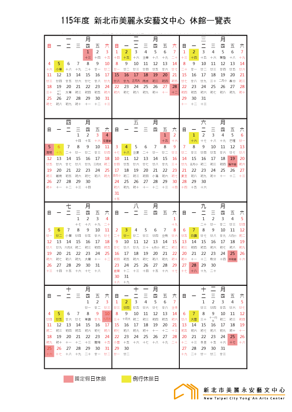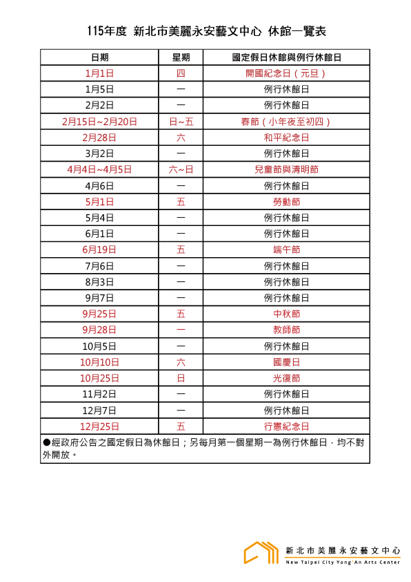 休館日為每個月第一個禮拜一及國定假日,政府公告之天然災害停止上班日,其他必要之休館日將另行公告