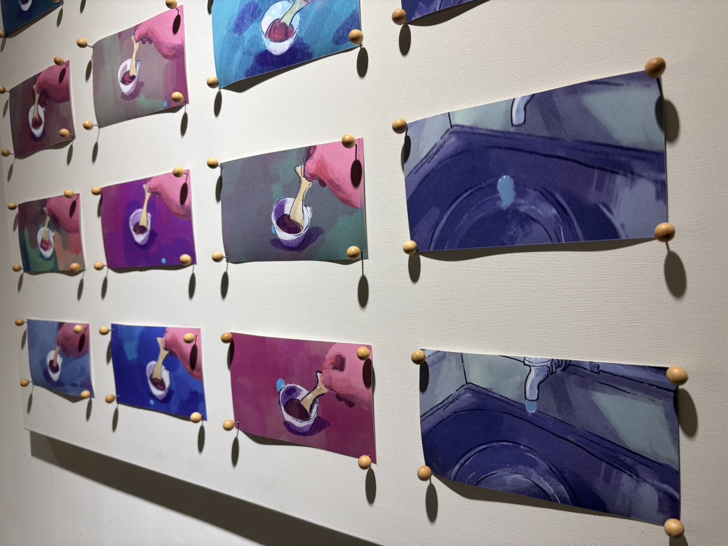 不均勻建立在具有共同系統性質的前提,比方都是液體、都是沙粒、都是織出布匹的經緯線,以及都是創作者。一杯分層的飲料或調酒,放久了它裡面的液體也終將均質,此次兩人的創作就像是在展場中的兩端中緩緩移動的分子;展場中兩位創作者同樣使用的媒材:色鉛筆、壓克力顏料等,以各自的繪畫風格、圖像敘事發展,兩種乍看特質不同的作品,在展覽中也像緩慢流動的分子一樣,相視、對話、蔓延交會,展現不盡相同的創作脈絡。